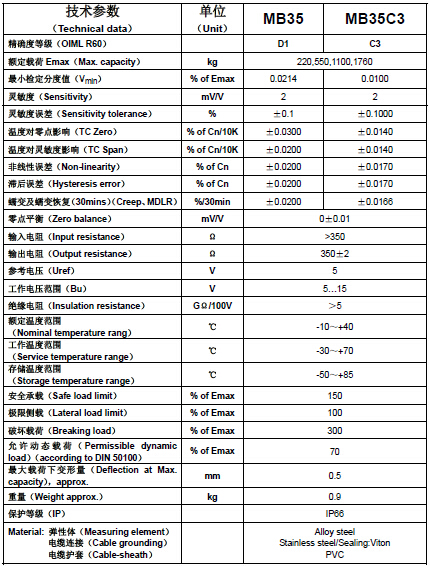 德國HBM稱重傳感器MB35C3/1.76T是一種剪切梁稱重傳感器,精確度等級C3,IP66保護等級,重量:0.9kg,-工作電壓范圍(Bu):5…15V,工作溫度范圍:-30~+70,允許動態(tài)載荷:70% of Emax.最大載荷下變形量:0.5mm。