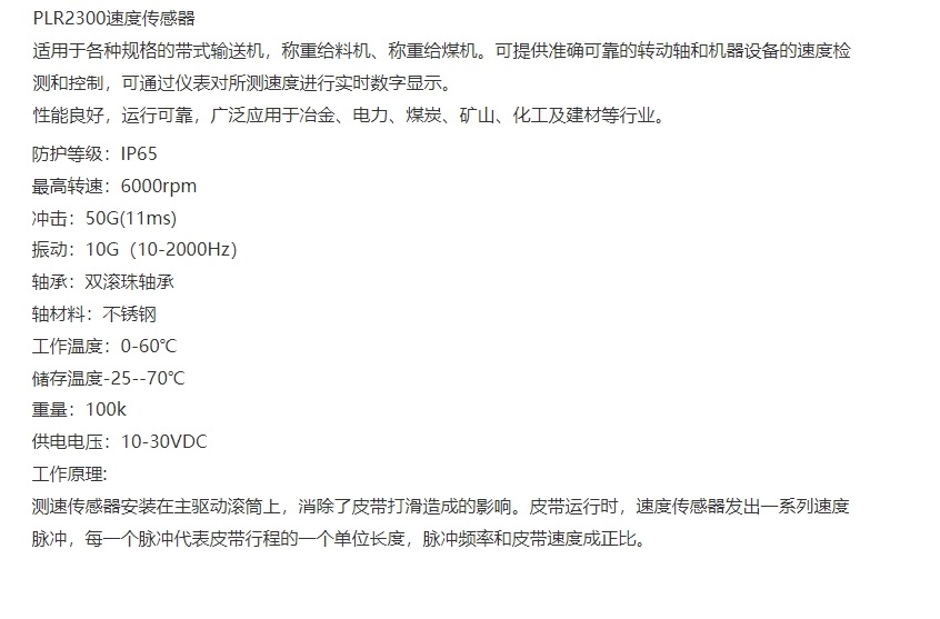 iqi廣州南創電子科技有限公司Saimo測速傳感器PLR2300產品介紹:iqi廣州南創電子科技有限公司賽摩測速傳感器PLR2300是一款專為皮帶秤設計的測速傳感器,由賽摩電氣股份有限公司生產。該傳感器通過測速滾筒與皮帶接觸獲得速度,并將皮帶速度轉換為一個脈沖信號,以便于二次儀表進行處理。