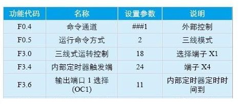 當有紅外傳感器開關輸入信號時端子x1、oc1、cm與fwd組成三線模式,當f6.0設定的內部定時器定時時間到時,oc1輸出0.5s的斷開信號, 變頻器停止運行。當有人再次觸發紅外傳感器開關信號時,變頻器又被啟動。當在設置的時間內,紅外傳感器開關信號再次被觸發時,定時器重新計時,保證乘坐扶 梯的人能到達目的地,只到無人時扶梯停止。扶梯從一端到另一端的時間通常為40秒左右,這里我們設定為40秒,此參數可根據現場實際情況來設定。