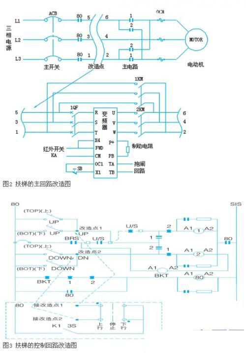 (2)控制回路的改造。扶梯的大部分保護電路都在控制回路。如果在改造中去掉了原有的部分保護電路或者改動了原有保護方式,都會影響扶梯的正常工作,甚至造成扶梯報故障。考慮到該因素,在改造過程中,不能改變原有保護電路,僅僅選擇了兩個點進行改造,如圖3所示。