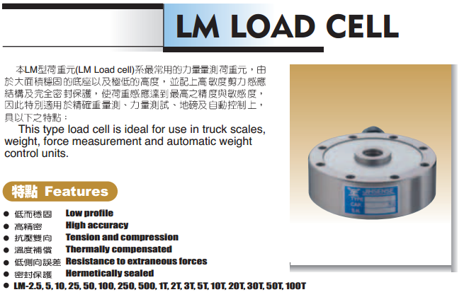 本LM型荷重元(LM Load cell)係最常用的力量量測荷重元,由於大面積穩(wěn)固的底座以及極低的高度,並配上高敏度剪力彈力結(jié)構(gòu)及完全密封保護,使荷重感應(yīng)達到最高之精度與敏感度,因此特別適用於精確重量測、力量測試、地磅及自動控制上,具以下之特點:
