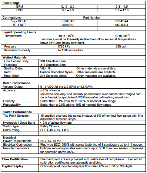 美國Proteus 500系列計(jì)量流量開關(guān)特性: