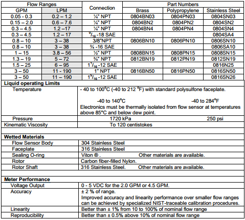 美國Proteus 800系列計量流量開關的性能和規(guī)格: