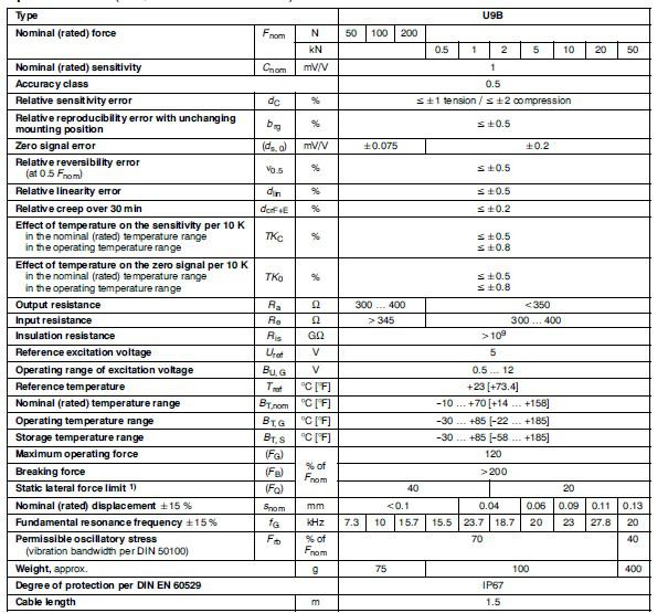 德國HBM 稱重傳感器U9B/20KN技術指標:7lh廣州南創電子科技有限公司