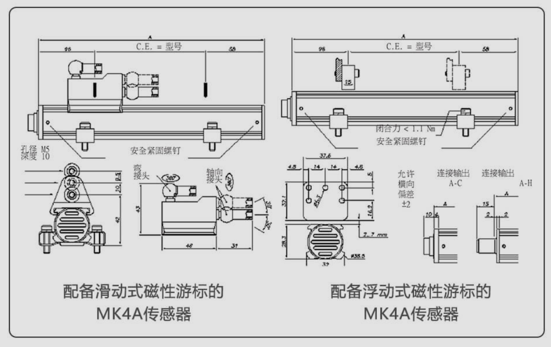 MK4系列磁致伸縮位移傳感器采用磁致伸縮技術(shù)的非接觸式線性位置傳感器。游標(biāo)上不存在電觸點(diǎn),因此不會發(fā)生磨損,使用壽命幾乎是無限長。小巧緊湊,易于安裝。完全不受外部介質(zhì)影響,可用在高污染和粉塵較大的惡劣環(huán)境中。出色的線性度,重復(fù)性好,耐機(jī)械振動(dòng)和沖擊。主要特點(diǎn):絕對測量傳感器;非接觸式傳感器,使用壽命更長;行程范圍:50 - 4,000mm;通過不銹鋼接頭快速插接;滑動(dòng)式或浮動(dòng)式磁性游標(biāo);游標(biāo)位置: 單或雙(最短距離 75mm);工作溫度: -30 - +75°C;耐振 (DIN IEC68T2/6 12g);防護(hù)等級:IP67;電磁兼容性認(rèn)證 CE (EN 50081-2 50082-1);電源 24Vdc ± 20%;內(nèi)部結(jié)構(gòu)經(jīng)過改進(jìn),帶有安全緊固螺釘。hSR廣州南創(chuàng)電子科技有限公司