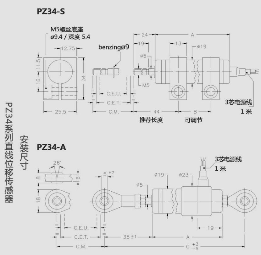xnU廣州南創電子科技有限公司杰佛倫gefran電子尺PZ-34-A-050 PZ-34-A-075尺寸圖:xnU廣州南創電子科技有限公司