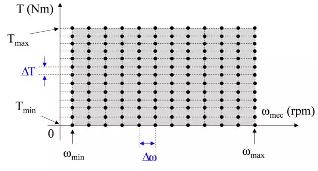 速度范圍 (ωmax-ωmin) 被分成多個等間距 Δω,合理的數量為 10 到 20。每個速度,扭矩變化也同樣按合理的點10到20,分成步進 ΔT 。結果就獲得了 扭矩-轉速 網格圖,包含 N = n x m 個點。