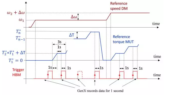 如圖所示,一個操作點持續了3秒。電機控制器產生了一個 TTL 信號給 HBM 數據記錄儀,當上升沿觸發被檢測到,數據記錄儀存儲了一秒的數據。按照所選操作點的數量,完整的過程持續了10到20分鐘。