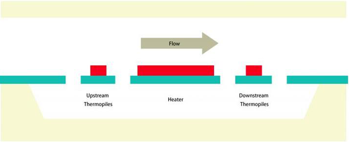 MEMS流量傳感器可利用單個或多個加熱器和溫度傳感器來制造。一種簡單的制造方法就是兩個溫度傳感器圍繞一個加熱器,并對稱地放置在左右兩邊。當加熱器(即電阻)通過電流加熱時,加熱器周圍就會形成穩態溫度曲線。當氣體(介質)不流動時,對稱的兩個溫度傳感器就會檢測到相同的溫度。當氣體流動時(如從左到右),熱空氣從左向右吹,此時,傳感器的溫度讀數就是右邊高于左邊。由于溫差與流速成正比(低流速時呈線性&高流速時呈非線性),我們可通過測量兩個溫度傳感器的溫差來確定流量。Kn1廣州南創電子科技有限公司