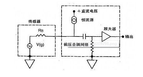 集成電路式壓電加速度傳感器的制成是微電子學技術的發展結果,在這種傳感器的殼體內裝有微電子信號適調電路,因此做到了低阻抗輸出,輸出信號大,對電纜和接頭帶來的干擾信號很不敏感,對各種環境因素不敏感,用一根雙線電纜或兩根塑料皮絞合線可同時起到供電和傳輸信號的作用,使用長電纜也不會降低靈敏度,不會增加噪聲,結構簡單,造價低,且改善了性能,特別適用于各種工程現場和需要遠距離測量的地方,對靈敏度高的甚至可以直接接記錄儀器,使用方便。Endevco稱這種傳感器為ISOTRON,下圖為等效電路圖。