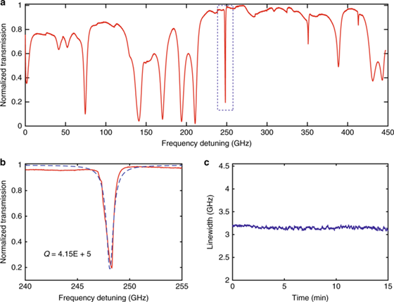 我們首先使用應用程序顯現(xiàn)了封裝的WGM傳感器的光譜特性,傳輸頻譜如圖2a所示,頻率跨度為450 GHz,從而可以觀察到具有不同共振頻率、品質(zhì)因數(shù)和極化的多個共振模式。具有更高品質(zhì)因數(shù)的諧振模式將有助于解決更小的頻率漂移,從而提高傳感性能。圖2b給出了高質(zhì)量模式和洛倫茲擬合的透射光譜,品質(zhì)因數(shù)為~4.2×1。為了驗證整個系統(tǒng)的穩(wěn)定性,記錄共振模式線寬的時間軌跡為15分鐘,觀察到3.15GHz的平均線寬,標準偏差為0.03GHz(圖2c)。