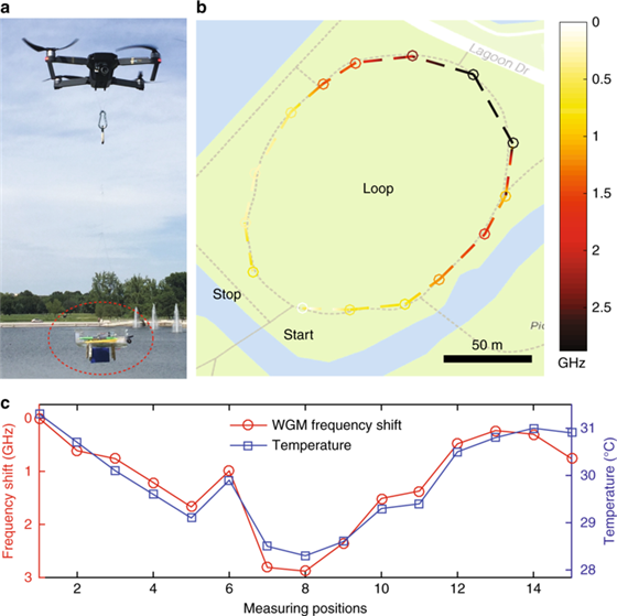 當無人機從一個測量位置飛到另一個測量位置時,WGM傳感器的共振頻率由于溫度變化而發(fā)生變化,共振頻率的變化如圖4b所示 ,其中可以清楚地看到溫度變化的梯度,測量結(jié)果與商用溫度計的結(jié)果匹配良好(圖 4c)。在補充材料中我們提供了視頻演示,其中攜帶整個系統(tǒng)的無人機從具有較高溫度(在陽光下)的一個位置飛行到具有較低溫度(在陰影中)的另一個位置,使用定制的移動應用程序可以清楚地觀察到共振頻率的偏移。