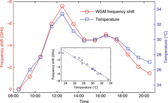 通過12小時的測量,我們獲得了所選諧振模式的頻移圖(如圖3所示) ,封裝WGM傳感器的共振頻率偏移與商用溫度計的結(jié)果匹配良好,并且與溫度變化具有線性關(guān)系(圖 3插圖)。兩條曲線的小偏差主要來自激光頻率的不穩(wěn)定性,通過優(yōu)化激光電流驅(qū)動器和TEC控制器的電路設計可以將偏差最小化。