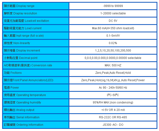 臺灣JIHSENSE JS-300係高功能、高精度荷重顯示器,本顯示器針對應變規式感測器而設計,有絕佳之穩定性,採用快速類比數位轉換器,及高接數位濾波器,取樣速度最快可達每秒500次;內部解析度高達50萬,顯示解析度最高可達2萬,具5位數LED顯示螢幕,有10個指示燈,隨時顯示其工作狀態,特別設計的高點保持及自動復歸功能,使量測自動循環起動,並具備5種常用之單位轉換,類比及數位輸出介面,易於與電腦或PLC連線。