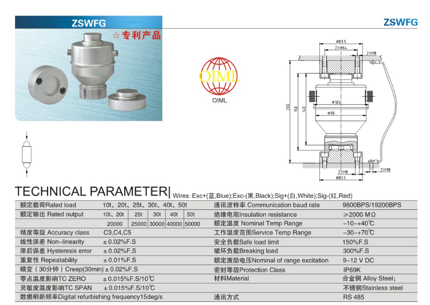 s3m廣州南創電子科技有限公司s3m廣州南創電子科技有限公司寧波柯力稱重傳感器ZSWFG-10t產品技術參數及尺寸圖:s3m廣州南創電子科技有限公司