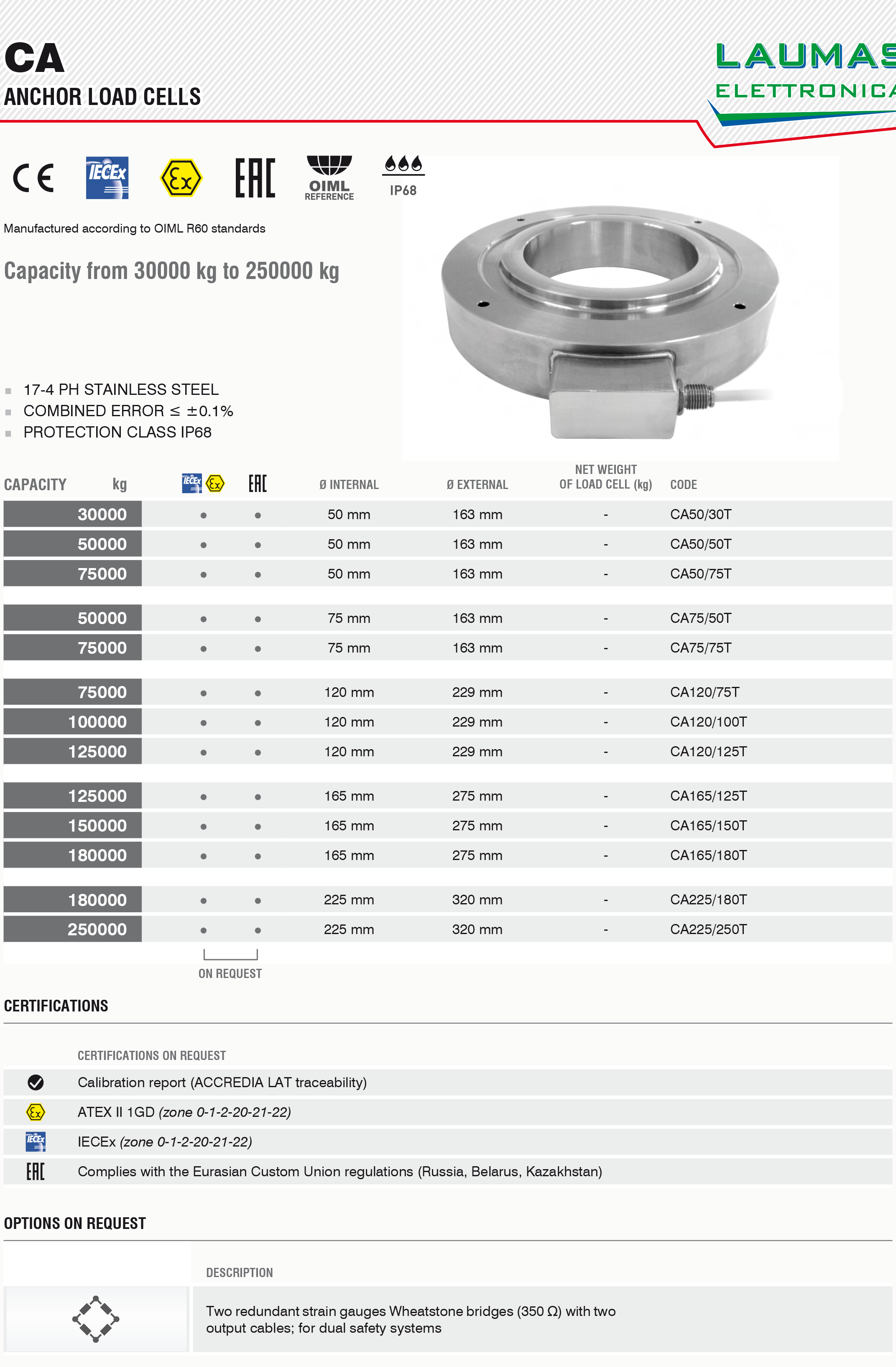 廣州南創(chuàng)專業(yè)供應(yīng)意大利Laumas CA系列稱重傳感器,【意大利Laumas CA系列】保證貨期快捷,100%原裝正品,10年行業(yè)經(jīng)驗(yàn)專注高端高質(zhì)傳感器服務(wù),提供自動(dòng)化完整解決方案。意大利Laumas FCK系列稱重傳感器相關(guān)型號(hào):CA-30000Kg, CA-50000Kg, CA-75000Kg, CA-100000Kg, CA-125000Kg, CA-150000Kg, CA-180000Kg, CA-250000Kg