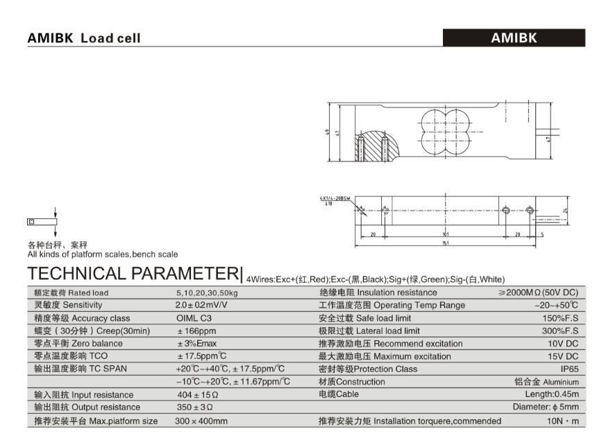 O0B廣州南創電子科技有限公司 O0B廣州南創電子科技有限公司寧波柯力稱重傳感器AMIBK-50kg產品技術參數:O0B廣州南創電子科技有限公司