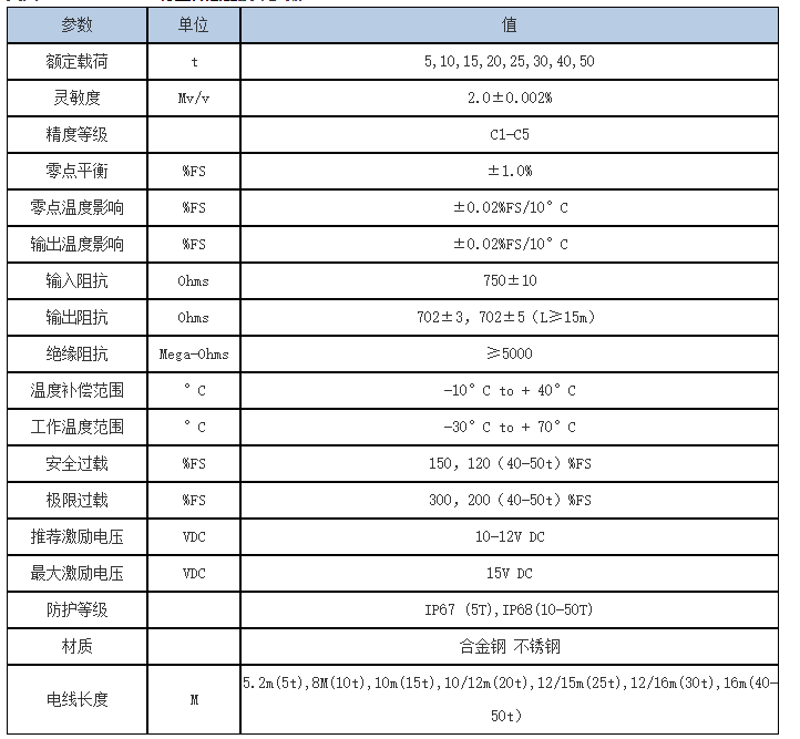 JF1廣州南創(chuàng)電子科技有限公司(三)MK 橋式結(jié)構(gòu)傳感器 1、QS/QS-A稱重傳感器,適用于汽車衡、軌道衡、配料秤等。型號有:QS-5t,QS-10t,QS-15t,QS-20t,QS-25t,QS-30t,QS-40t,QS-50t。QS-D-5t,QS-D-10t,QS-D-15t,QS-D-20t,QS-D-25t,QS-D-30t,QS-D-40t,QS-D-50t。 2、QSB-A/-SS稱重傳感器,適用于汽車衡、軌道衡、軸量秤、地上衡、倉儲秤等。型號有:QSB-10klb,QSB-20klb,QSB-25klb,QSB-40klb,QSB-50klb,QSB-60klb,QSB-75klb。QSB-SS-10klb,QSB-SS-20klb,QSB-SS-25klb,QSB-SS-40klb,QSB--SS-50klb,QSB-SS-60klb,QSB-SS-75klb。 3、QSC-A/-SS稱重傳感器,適用于汽車衡、軌道衡、軸量秤、地上衡、倉儲秤等。BT5t,BT10t,BT15t,BT20t,BT25t,BT30t,BT40t,BT50t。BTD-5t,BTD-10t,BTD-15t,BTD-20t,BTD-25t,BTD-30t,BTD-40t,BTD-50t; 4、QSF-A/-SS稱重傳感器,適用于汽車衡、軌道衡、軸量秤、地上衡、倉儲秤等。型號有:QSF-2klb,QSF-2.5klb,QSF-3klb,QSF-5klb,QSF-10klb,QSF-25klb,QSF-35klb。QSF-SS-2klb,QSF-SS-2.5klb,QSF-SS-3klb,QSF-SS-5klb,QSF-SS-10klb,QSF-SS-25klb,QSF-SS-35klb。 5、QSE-A/-SS稱重傳感器,適用于汽車衡、軌道衡、軸量秤、地上衡、倉儲秤等。型號有:QSE-30klb,QSE-50klb,QSE-60klb,QSE-75klb。QSE-SS-30klb,QSE-SS-50klb,QSE-SS-60klb,QSE-SS-75klb。 6、QSEB-A/-SS稱重傳感器,適用于汽車衡、軌道衡、軸量秤、地上衡、倉儲秤等。型號有:QSEB-A/-SS-25klb,QSEB-A/-SS-40klb,QSEB-A/-SS-50klb,QSEB-A/-SS-60klb,QSEB-A/-SS-75klb,QSEB-A/-SS-100klb,QSEB-A/-SS-125klb。 7、QSG/QSG-A稱重傳感器,適用于鋼包秤、罐裝秤及各種起重機(jī)械。型號有:QSG/QSG-1t,QSG/QSG-2t,QSG/QSG-3t,QSG/QSG-5t,QSG/QSG-10t,QSG/QSG-15t,QSG/QSG-20t,QSG/QSG-25t,QSG/QSG-30t,QSG/QSG-40t。 8、QSN/QSN-A稱重傳感器,適用于鋼包秤、天車秤。型號有:QSN/QSN-10t,QSN/QSN-20t,QSN/QSN-30t,QSN/QSN-40t,QSN/QSN-50t。 9、QSNB-A稱重傳感器,適用于鋼包秤、天車秤。型號有:QSNB-10t,QSNB-15t,QSNB-20t,QSNB-25t,QSNB-30t。 10、QSJ/QSJ-A稱重傳感器,適用于軌道衡、料斗秤等。型號有:QSJ/QSJ-0.5t,QSJ/QSJ-2t,QSJ/QSJ-3t。 11、QSK-A稱重傳感器,適用于鋼包秤、天車秤等。型號有:QSK-10t,QSK-15t,QSK-20t,QSK-30t,QSK-40t,QSK-50t,QSK-60t。 12、QSP-A稱重傳感器,適用于輕軌軌道衡。型號有:QSP-5t。 13、QSPG-A稱重傳感器,適用于輕軌軌道衡。型號有:QSPG-5t。 14、GG-A稱重傳感器,適用于鋼包秤、軌道衡、天平秤。型號有:GG-2t,GG-5t,GG-10t,GG-15t,GG-20t,GG-30t,GG-40t,GG-50t,GG-80t,GG-100t。 15、GGB-A稱重傳感器,適用于輕軌軌道衡。型號有:GGB-5t。 16、BTE-A稱重傳感器,適用于各種軌道衡。型號有:BTE-15t,BTE-20t。 17、BTL-A稱重傳感器,適用于各種軌道衡。型號有:BTL-15t。 18、BTG-A稱重傳感器,適用于各種軌道衡。型號有:BTG-12.5t,BTG-30t。 19、BTGE稱重傳感器,適用于各種軌道衡。型號有:BTGE-3t。 20、BTKB稱重傳感器,適用于吊鉤秤、拉式測力裝置。型號有:BTKB-800kg。 21、BT-A稱重傳感器,適用于天車秤等。型號有:BT-10t,BT-15t,BT-20t。 22、SCE-A稱重傳感器,適用于鋼絲繩、過載報警場合及張力稱重裝置。型號有:SCE-3t。 23、XZB稱重傳感器,適用于各種安全限制專用。型號有:XZB-3t。 XZB/-SS稱重傳感器,適用于各種軌道衡。型號有:XZB/-SS-25t。 24、GGF-A稱重傳感器,適用于輕軌軌道衡。型號有:GGF-2t,GGF-2.5t,GGF-3t,GGF-5t。 25、XZBC-X稱重傳感器,適用于各種安全限制專用。型號有:XZBC-X-2t,XZBC-X-3t,XZBC-X-4t,XZBC-X-5t。 26、XZBC-TCX稱重傳感器,適用于各種安全限制裝用。 27、SCEB-A稱重傳感器,適用于鋼絲繩、過載報警場合及各種張力稱重裝置。型號有:SCEB-2t,SCEB-3t。 28、SCN稱重傳感器,適用于拉式測力裝置。型號有:SCN-1t,SCN-2t,SCN-3t,SCN-5t,SCN-10t, 29、BTU稱重傳感器,適用于軌道衡。型號有:BTU-20t。BTB-0.3t,BTB-0.5t,BTB-1t,BTB-2t,BTB-3t,BTB-5t,BTB-7.5t,BTB-10t,BTB-15t,BTB-20t,BTB-25t。 30、DT-A稱重傳感器,適用于各種安全限制裝置及各種張力稱重裝置。型號有:DT-5t。 31、DTE-A稱重傳感器,適用于各種張力稱重裝置。型號有:DTE-5t。 32、QSEC稱重傳感器,適用于汽車衡。型號有:QSEC-50klb,QSEC-60klb,QSEC-75klb。 33、BTQ-A稱重傳感器,適用于輕軌衡、天車秤。型號有:BTQ-1.5t,BTQ-3t,BTQ-5t。 34、BTW-X稱重傳感器,適用于起重量限制器。型號有:BTW-X-1.5t,BTW-X-2.5t,BTW-X-4t,BTW-X-5t,BTW-X-7.5t,BTW-X-10t。 35、SB/SB-A/-SS稱重傳感器,適用于汽車衡、平臺秤、配料秤等。型號有:SB-0.3t,SB-0.5t,SB-1t,SB-2t,SB-3t,SB-5t,SB-7.5t,SB-10t,SB-15t,SB-20t,SB-25t。 36、QSFB-A稱重傳感器,適用于汽車衡。型號有:QSFB-20t。 37、QSMC稱重傳感器,適用于汽車衡、軌道衡、配料秤等。型號有:QSMC-50t,QSMC-100t,QSMC-150t,QSMC-200t。 38、MBB稱重傳感器,適用于皮帶秤。型號有:MBB-100lb,MBB-150lb,MBB-200lb,MBB-250lb。 (四)MK 數(shù)字傳感器 1、WXJ數(shù)字稱重傳感器,適用于各種測力場合、取代萬向節(jié)應(yīng)用及計量。型號:WXJ-300kg,WXJ-400kg,WXJ-500kg。 2、DTC-A數(shù)字稱重傳感器,適用于限載裝置。型號:DTC-2.5t。 3、DG數(shù)字稱重傳感器,適用于吊鉤秤。型號:DG-1t,DG-3t,DG-5t,DG-7.5t,DG-15t。 4、DGB數(shù)字稱重傳感器,適用于吊鉤秤。型號:DGB-10t。 5、ZSN-D數(shù)字稱重傳感器,適用于汽車衡、軌道衡、軸量秤、地上秤。型號:ZSN-D-500000碼。 6、ZSF-D數(shù)字稱重傳感器,適用于汽車衡、軌道衡、軸量秤、地上秤。型號:ZSF-D-500000碼。 7、ZSGB-D數(shù)字稱重傳感器,適用于汽車衡、軌道衡。型號:ZSGB-D-500000碼。 8、QS-D數(shù)字稱重傳感器,適用于汽車衡、軌道衡、軸量秤等。型號:QS-D-500000碼。 (五)MK 其他結(jié)構(gòu) 1、YBSK-A稱重傳感器,適用于軸座計量。型號:YBSK-5t。 2、YBSG-A稱重傳感器,適用于輪