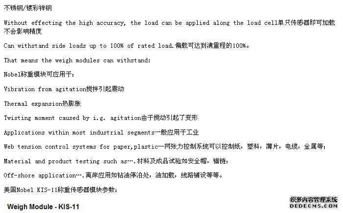 美國Vishay Nobel稱重模KIS-11-50KN塊高精度,高安全稱重傳感器配合安裝模塊穩定性好,含有壓電薄膜,備用有一般非防爆型及防爆型規格供選購,動態加載模塊的安裝:四動態加載模塊的安裝,一般三面有限的兩個模塊,其他兩個模塊只在最后期限。gLh廣州南創電子科技有限公司