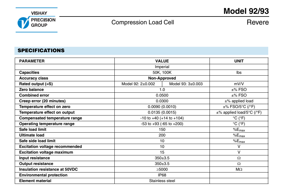 美國vishay Revere稱重傳感器93-50klbs產品技術參數:W4K廣州南創電子科技有限公司