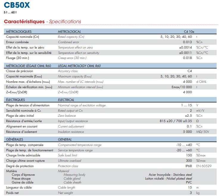 法國世感Scaime稱重傳感器CB50X-30T產品參數圖:S42廣州南創電子科技有限公司