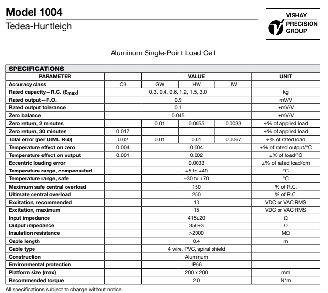 特迪亞tedea稱重傳感器1004-0.3KGGW技術參數圖:ibr廣州南創電子科技有限公司