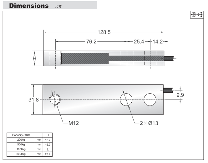 美國傳力Transcell稱重傳感器SBST-1000kg技術參數圖:pcJ廣州南創電子科技有限公司