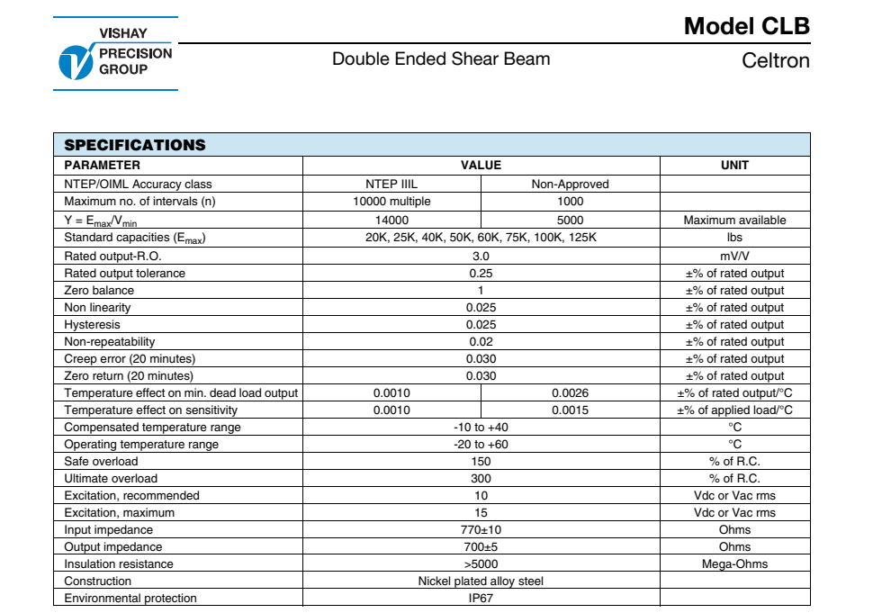 vishay celtron CLB-50klb稱重傳感器型號類別技術參數選型安裝等資料信息,如果有關