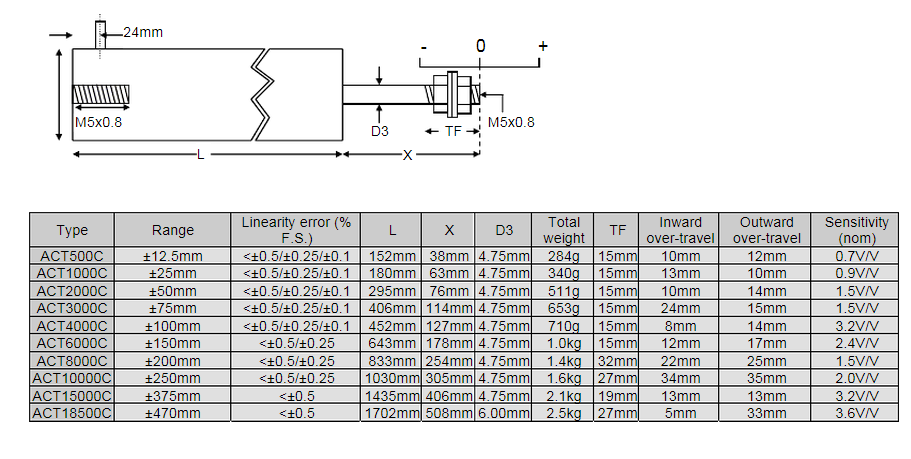英國RDP DCTH2000C位移傳感器系列位移傳感器所有量程如下: